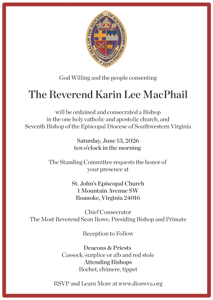 Registration guarantees a place at St. John’s (Roanoke). Upon arrival, registered people will be seated on a first-come, first-served basis, starting in the Nave, and then moving to overflow seating in the Parish Hall and Chapel. The committee is working to ensure that those seated beyond the Nave will be fully included in our worship, will receive communion, and will be accompanied by members of the choir. Following the Ordination and Consecration, all present are invited to celebrate by joining the reception on the grounds of St. John’s!